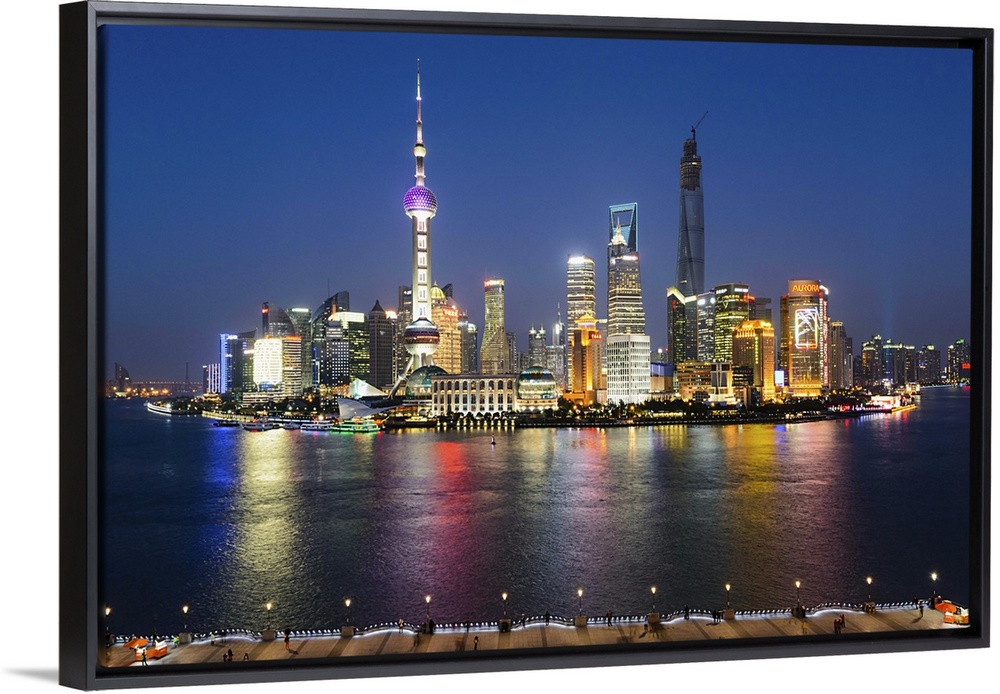 <p>China, Shanghai, Pudong, Oriental Pearl Tower, Lujiazui Financial District skyline with Jinmao Tower, Shanghai World Financial Centre and Shanghai Tower illuminated at night.</p>