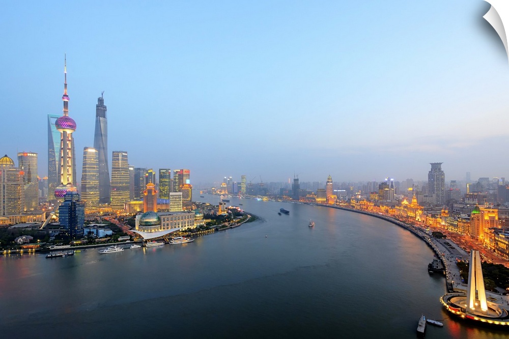 <p>China, Shanghai, Pudong, Oriental Pearl Tower, Lujiazui Financial District skyline with Jinmao Tower, Shanghai World Financial Centre and Shanghai Tower illuminated at dusk.</p>