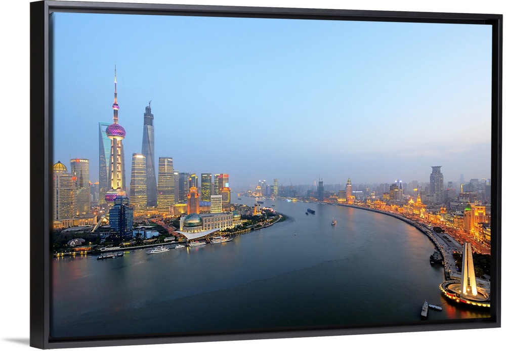 <p>China, Shanghai, Pudong, Oriental Pearl Tower, Lujiazui Financial District skyline with Jinmao Tower, Shanghai World Financial Centre and Shanghai Tower illuminated at dusk.</p>