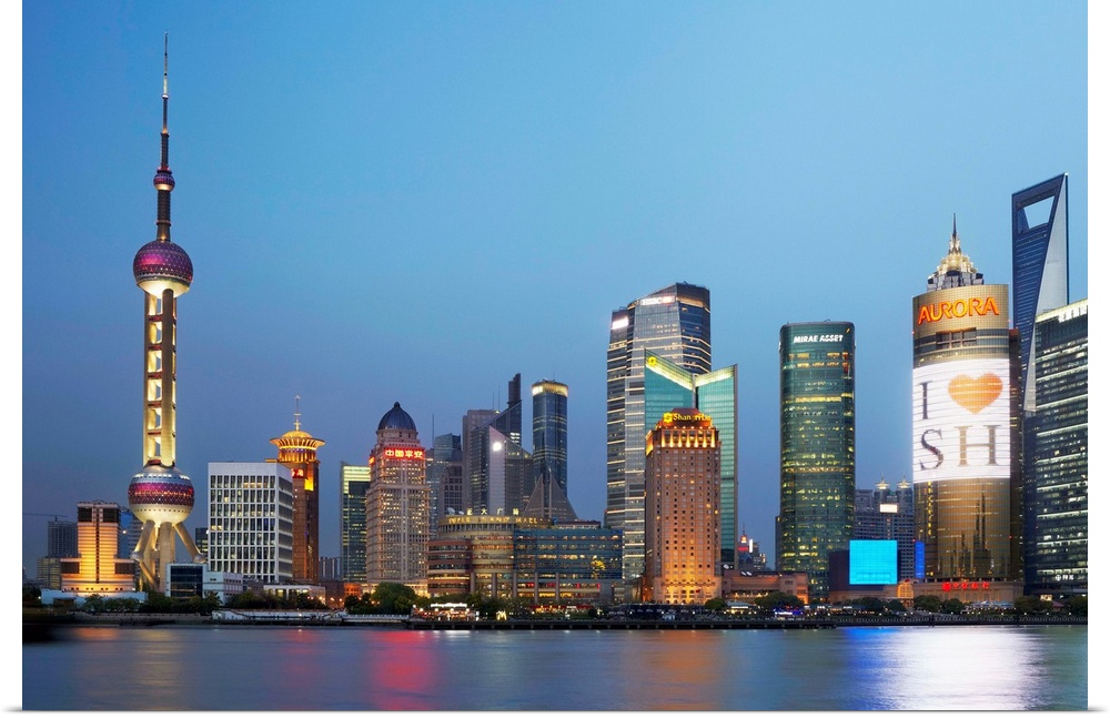 <p>China, Shanghai, Pudong, Oriental Pearl Tower, Skyline with Oriental Pearl Tower and Huangpu River illuminated at night.</p>
