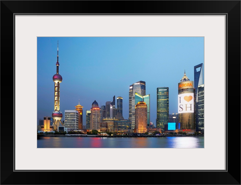 <p>China, Shanghai, Pudong, Oriental Pearl Tower, Skyline with Oriental Pearl Tower and Huangpu River illuminated at night.</p>