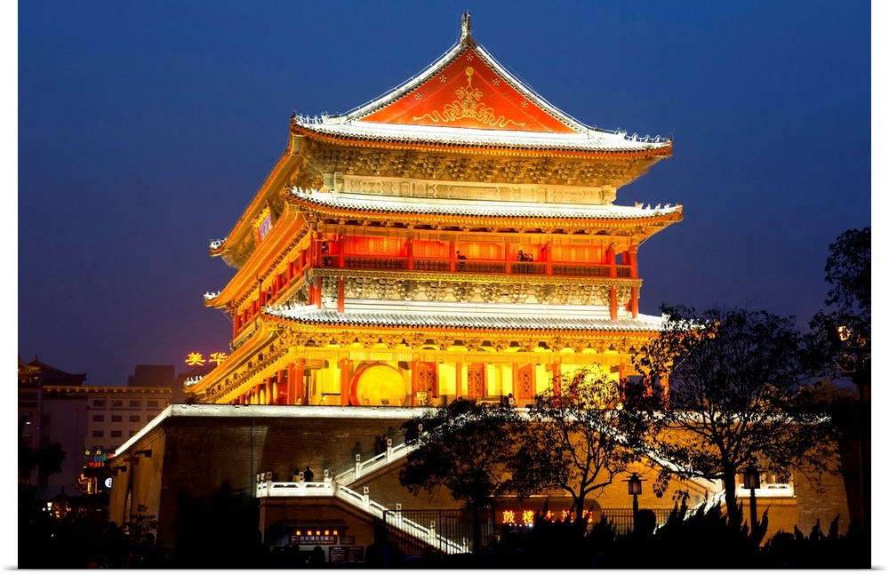 <p>China, Shanxi, Sian, Drum tower lit up at night in the centre of Xian.</p>