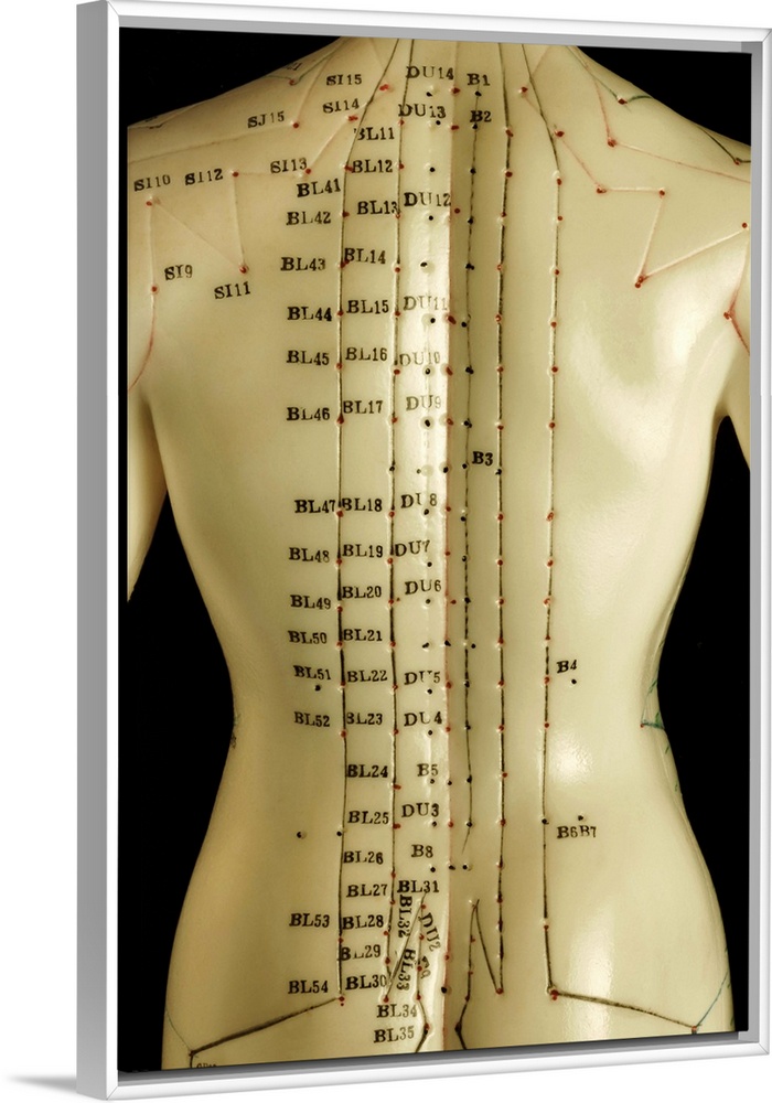 <p>Chinese acupuncture model. Back of a Chinese acupuncture model, with marking and numbers and labels to show the acupuncture points and lines (meridians). Acupuncture is a traditional Chinese system of medicine. It claims that meridians act as channels for flowing life force or Qi. Each of the meridians is believed to connect through internal pathways to one of the internal organs. Diseases are considered to be due to interruptions in the flow of Qi. Inserting needles into the correct points is thought to restore the flow and cure disease.</p>