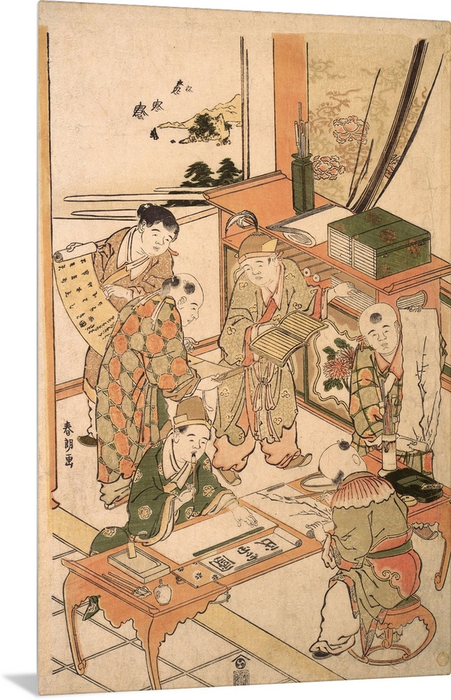 <p>Woodblock print of a group of students learning to use calligraphy.</p>