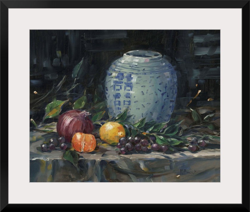 <p>Still life painting of a Chinese urn with fruit.</p>