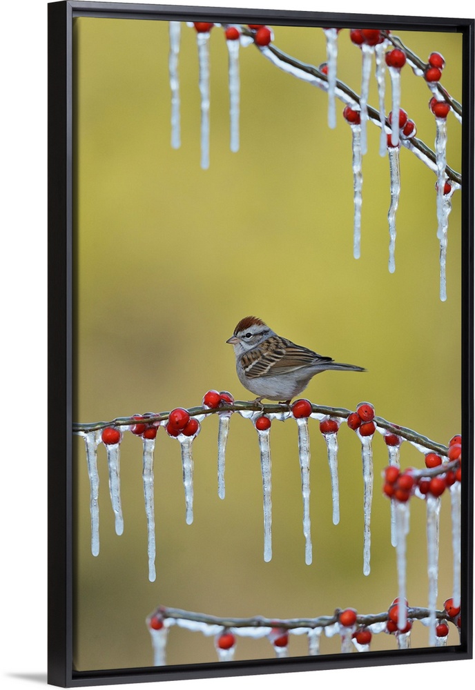 <p>Chipping Sparrow (Spizella passerina), adult perched on icy branch of Possum Haw Holly (Ilex decidua) with berries, Hill Country, Texas, USA</p>