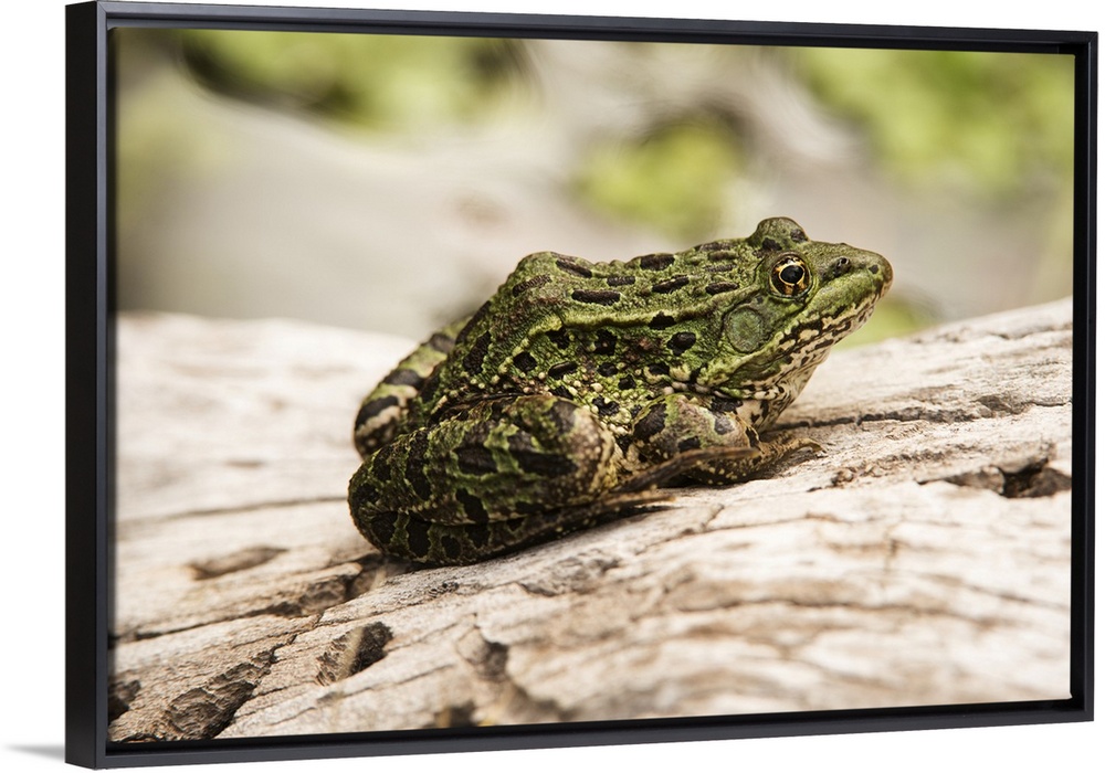 <p>Chiricahua Leopard Frog (Rana chiricahuensis), a threatened species, sunning on a log near Cave Creek in the Chiricahua Mountains near Portal; Arizona, United States of America.</p>