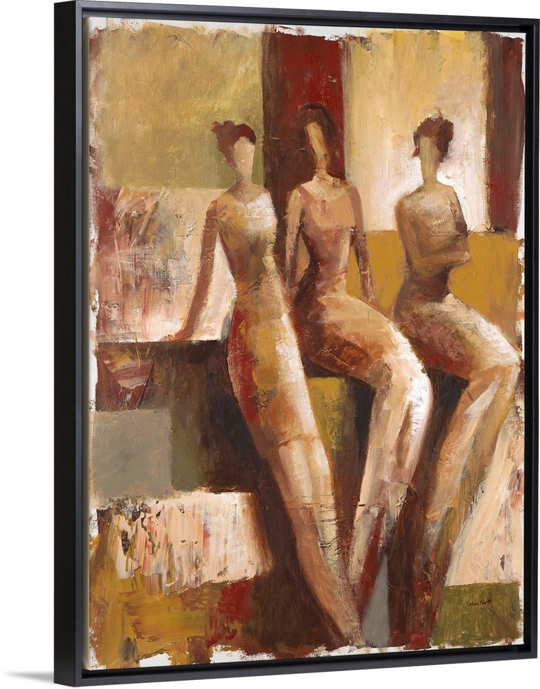 <p>Contemporary painting of three female figures standing against an earth toned geometric background.</p>