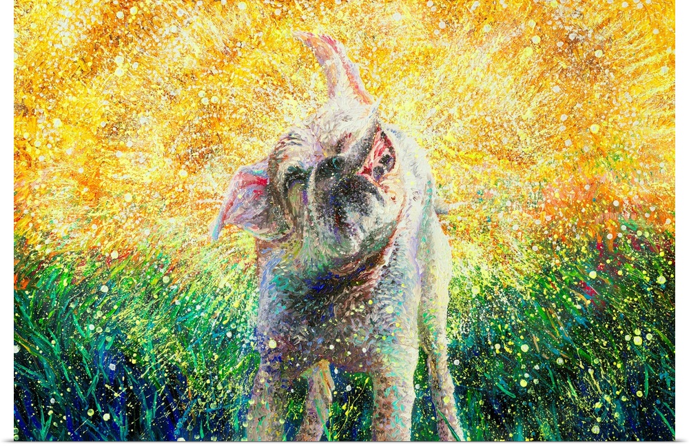 <p>Brightly colored contemporary artwork of a small dog shaking off water.</p>
