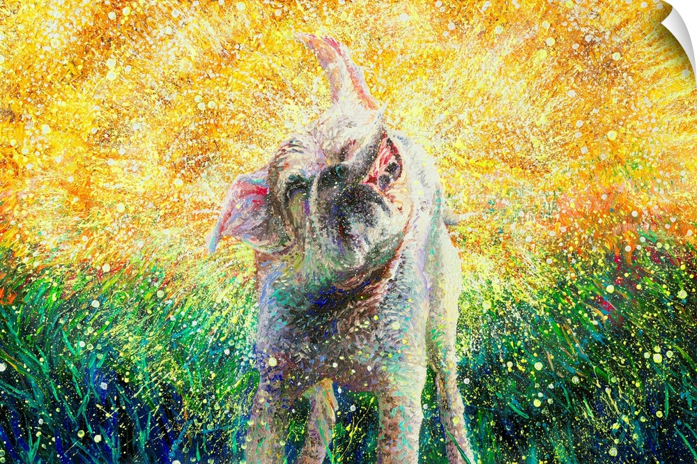 <p>Brightly colored contemporary artwork of a small dog shaking off water.</p>