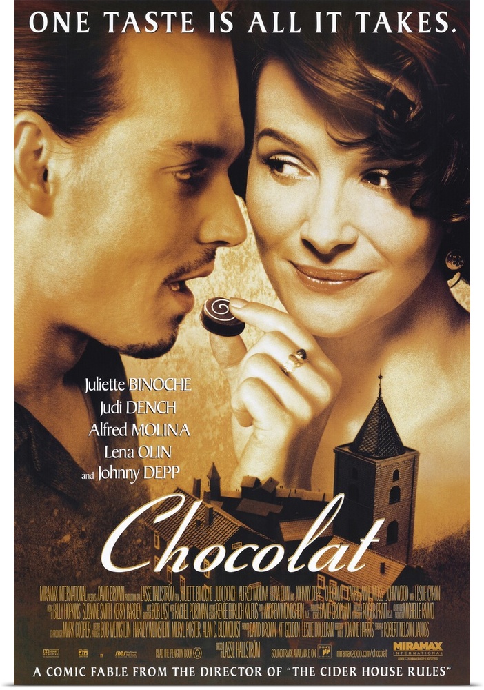 <p>Free-spirited Vianne (Binoche) and her young daughter Anouk (Thivisol) are literally blown into the dull French town of Lansquenet in the late 1950s. Before the scandalized eyes of the Comte de Reynaud (Molina), the community's moral arbitrator, the unmarried hussy opens a chocolaterie--during Lent! While the Comte tries to rally the residents to boycott the establishment, Vianne's delicacies are setting the townspeople's pulses racing, as she becomes intrigued by gypsy vagabond Roux (Depp). Sweetly predictable if overly chastising against religion and conventional morality. Binoche is radiant as usual (and have some chocolate handy when you watch). Based on the novel by Joanne Harris.</p>
