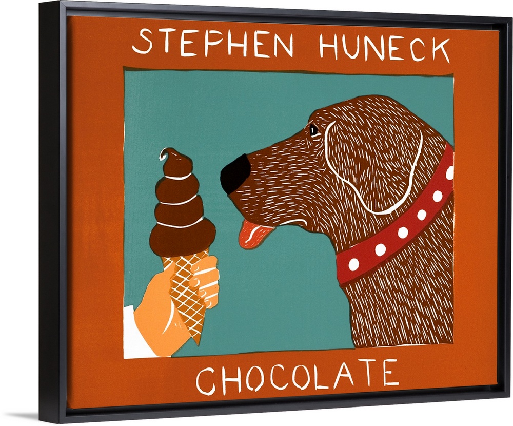 <p>Illustration of a chocolate lab about to lick a chocolate ice cream cone with the word "Chocolate" written at the bottom and the artists name, "Stephen Huneck" at the top, all with an orange boarder.</p>