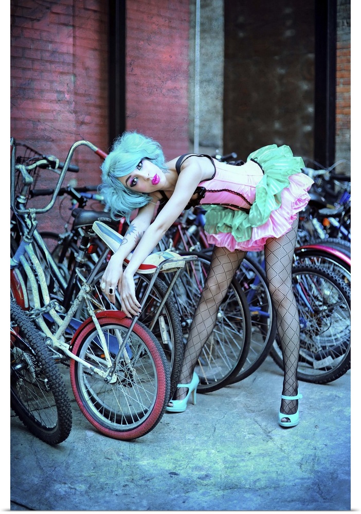 <p>A blue-haired model poses in a tutu against a rack of bikes with a surprised expression.</p>