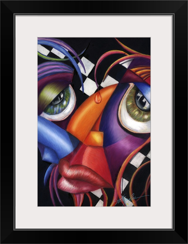 <p>Contemporary artwork in the style of cubism of a face in bold colors.</p>