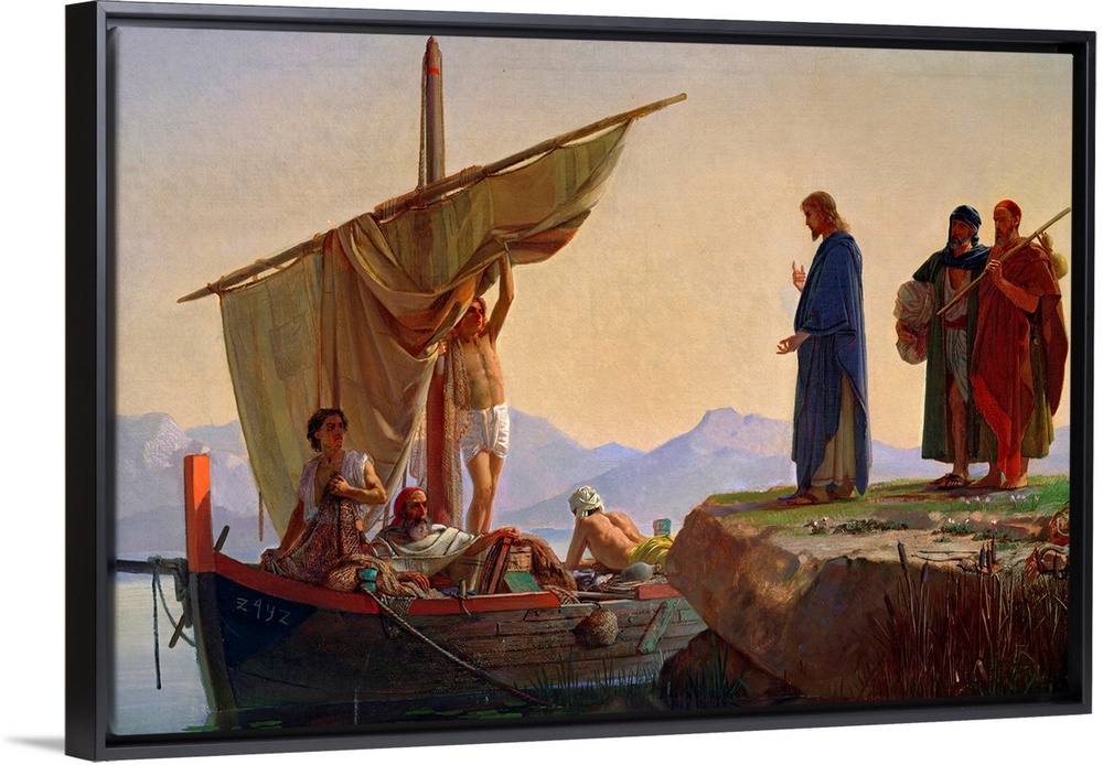 <p>Classic artwork with Christ standing on the edge of a small cliff with two men standing just behind him and a boat in the water full of people.</p>