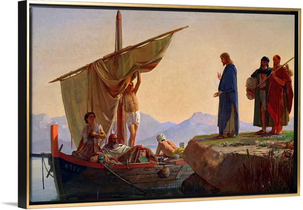 <p>Classic artwork with Christ standing on the edge of a small cliff with two men standing just behind him and a boat in the water full of people.</p>