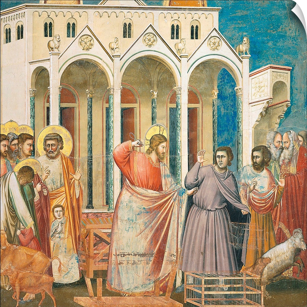 <p>Scenes from the Life of Christ Expulsion of the Money changers from the Temple, by Giotto, 1304 - 1306, 14th Century, fresco, - Italy, Veneto, Padua, Scrovegni Chapel. All. Jesus drives a merchant away building Temple portico porch goats. (524119) Everett</p>