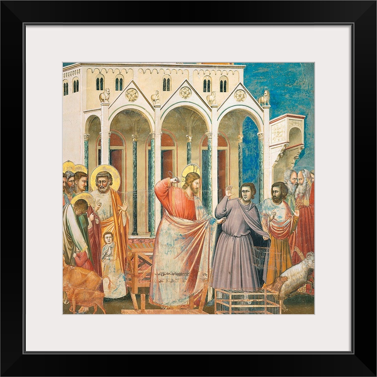 <p>Scenes from the Life of Christ Expulsion of the Money changers from the Temple, by Giotto, 1304 - 1306, 14th Century, fresco, - Italy, Veneto, Padua, Scrovegni Chapel. All. Jesus drives a merchant away building Temple portico porch goats. (524119) Everett</p>