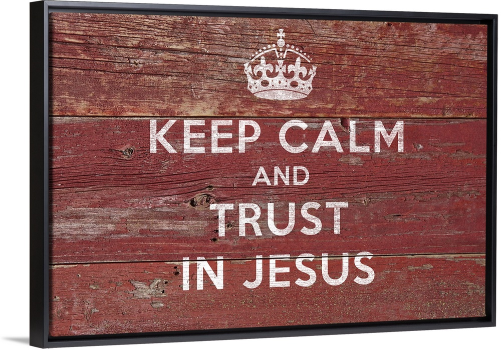 <p>"Keep Calm And Trust In Jesus" with a crown in white on a wood backdrop.</p>