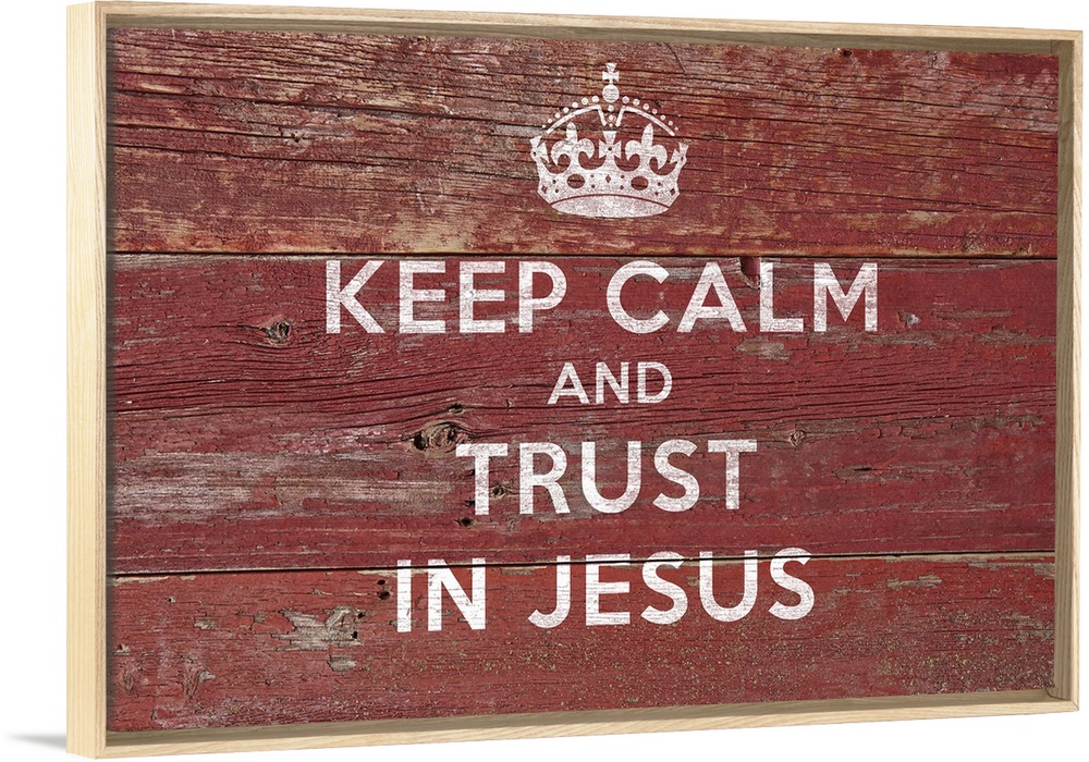 <p>"Keep Calm And Trust In Jesus" with a crown in white on a wood backdrop.</p>