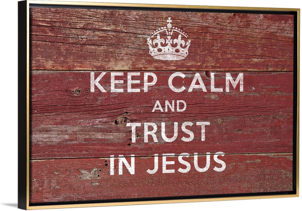 <p>"Keep Calm And Trust In Jesus" with a crown in white on a wood backdrop.</p>