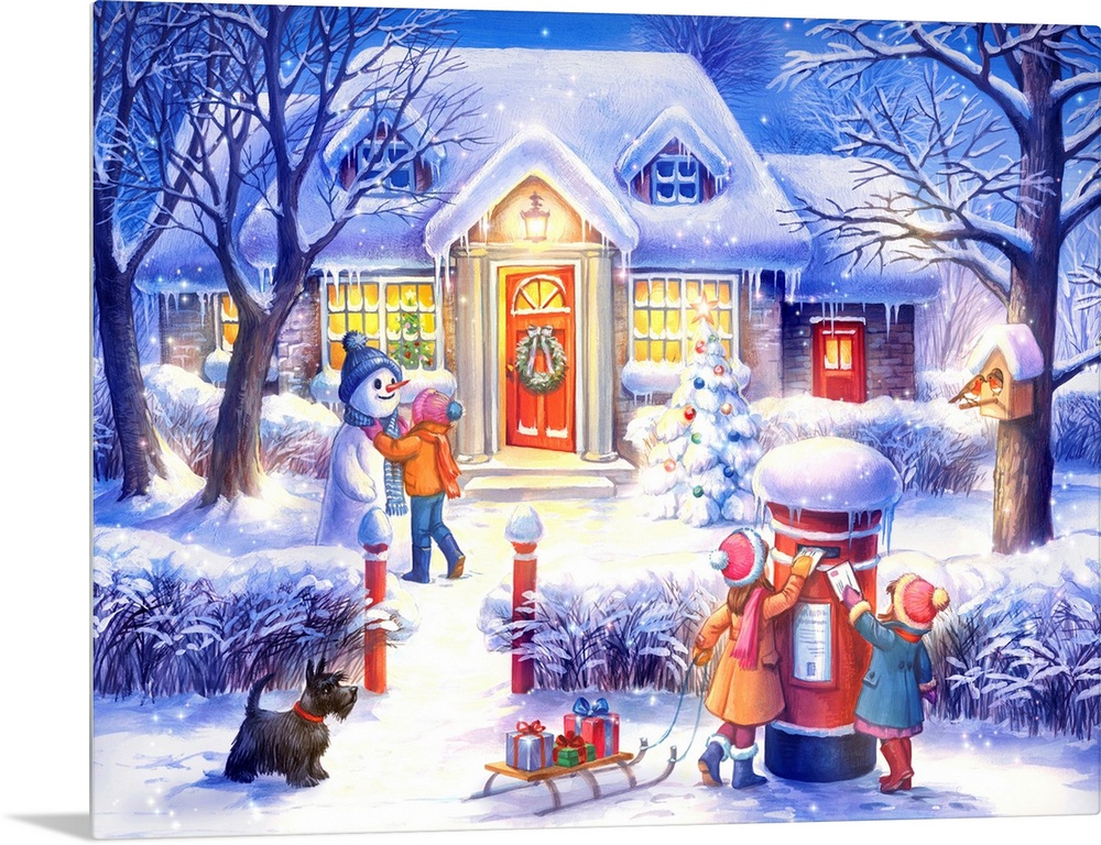 <p>Artwork of kids playing in the snow in their front yard on a snowy night. There is a sled with gifts, a dog, snowman, and tree covered in holiday lights. The house is lit up with reef on the door.</p>