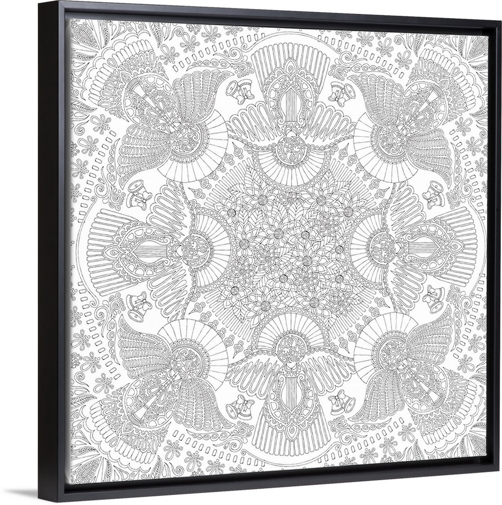 <p>Black and white line art of a mandala made out of intricately designed Christmas Angels and flowers.</p>