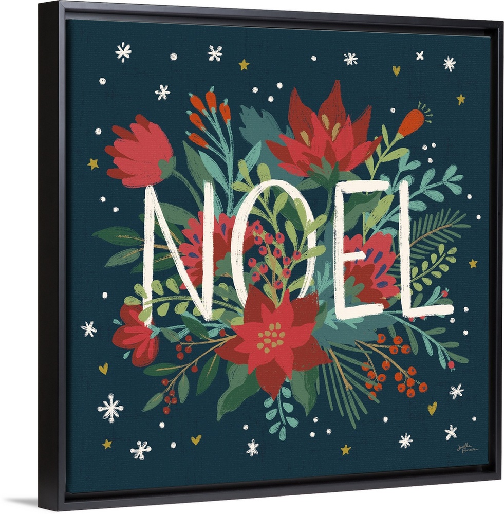 <p>Decorative artwork of red flowers and leaves with the text "Noel" on a dark navy background.</p>