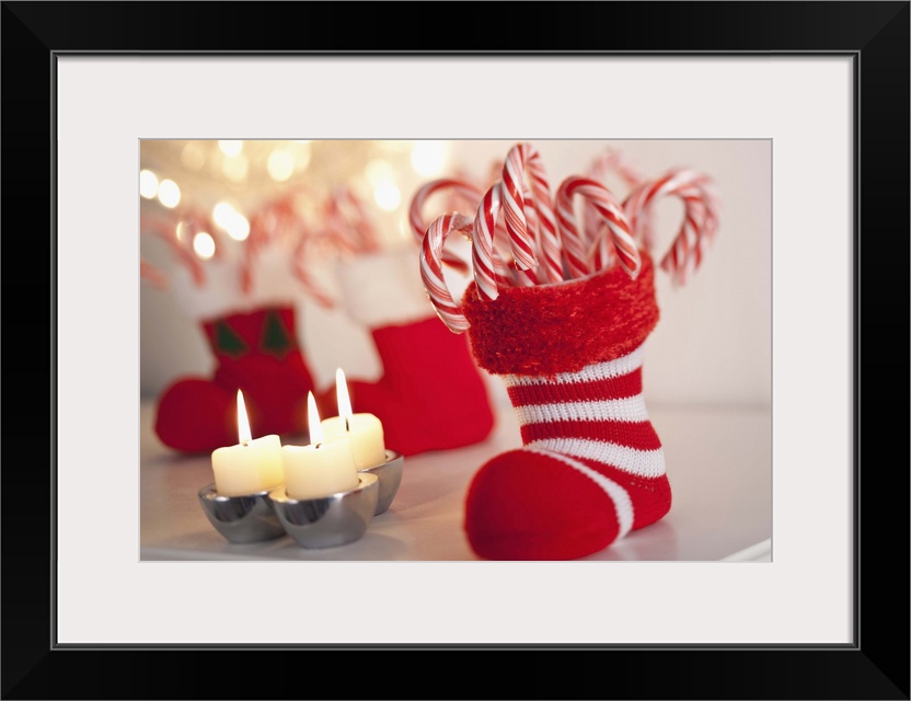 <p>christmas candy caine in stocking with candles</p>