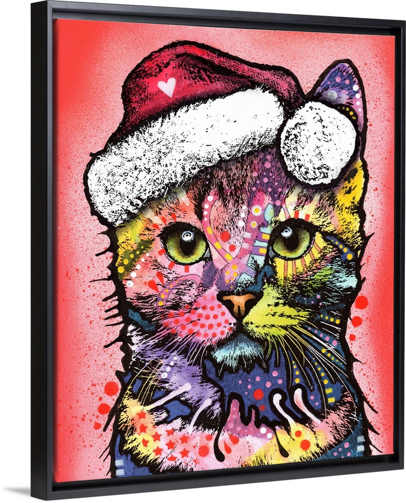 <p>Cute painting of a colorful kitten wearing Santa's hat on a red spray painted background.</p>