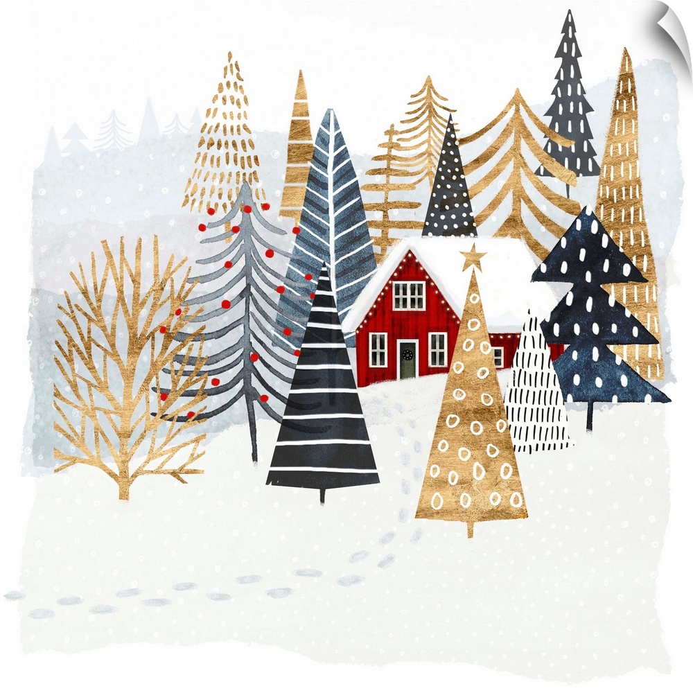<p>Festively patterned trees in gold and shades of blue surround a red house and embellish a snowy landscape in this decorative holiday decor.</p>