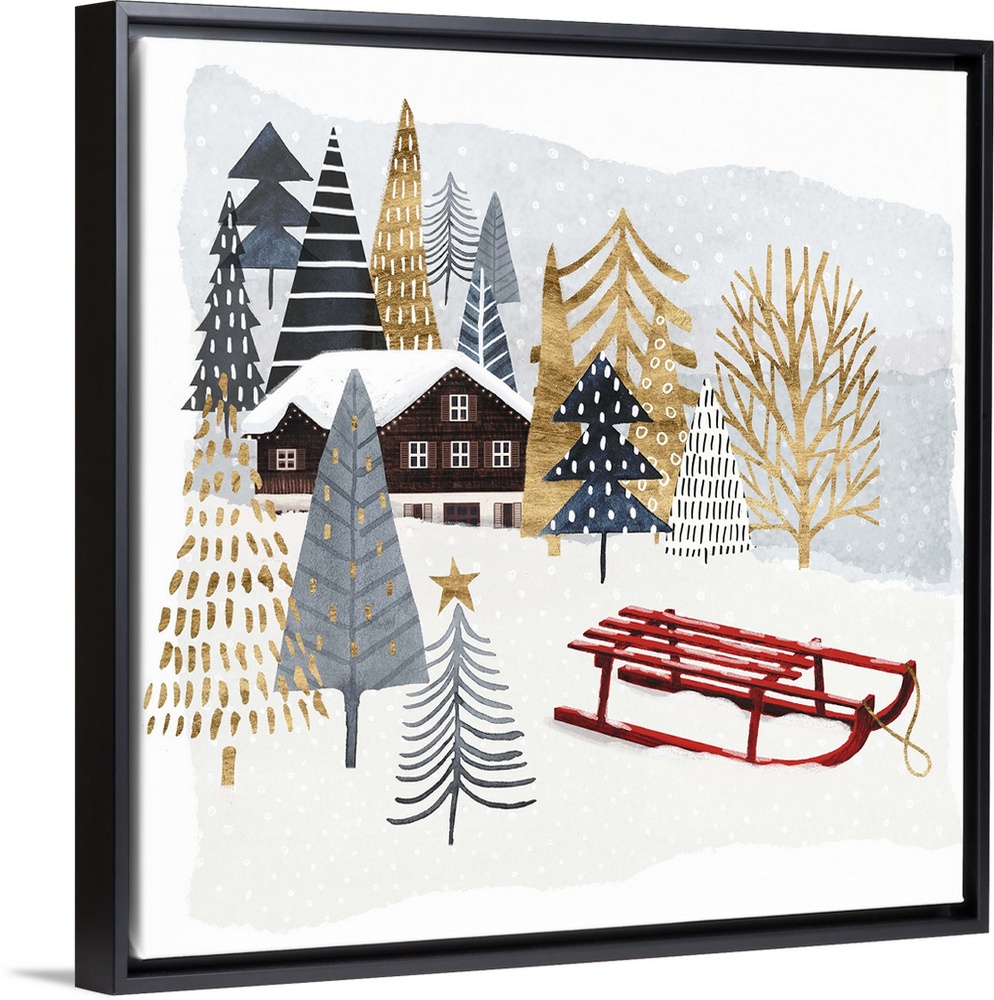 <p>Festively patterned trees in gold and shades of blue surround a brown house and a bright red sled embellishes the snowy landscape in this decorative holiday decor.</p>