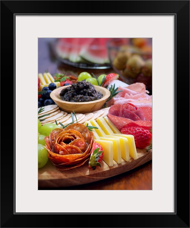 <p>Christmas charcuterie festive cheese board. Fresh cheddar cheese, wide mix of fresh fruits with grapes, strawberries, blueberry and salami, iberico ham and truffle sauce. Singapore.</p>