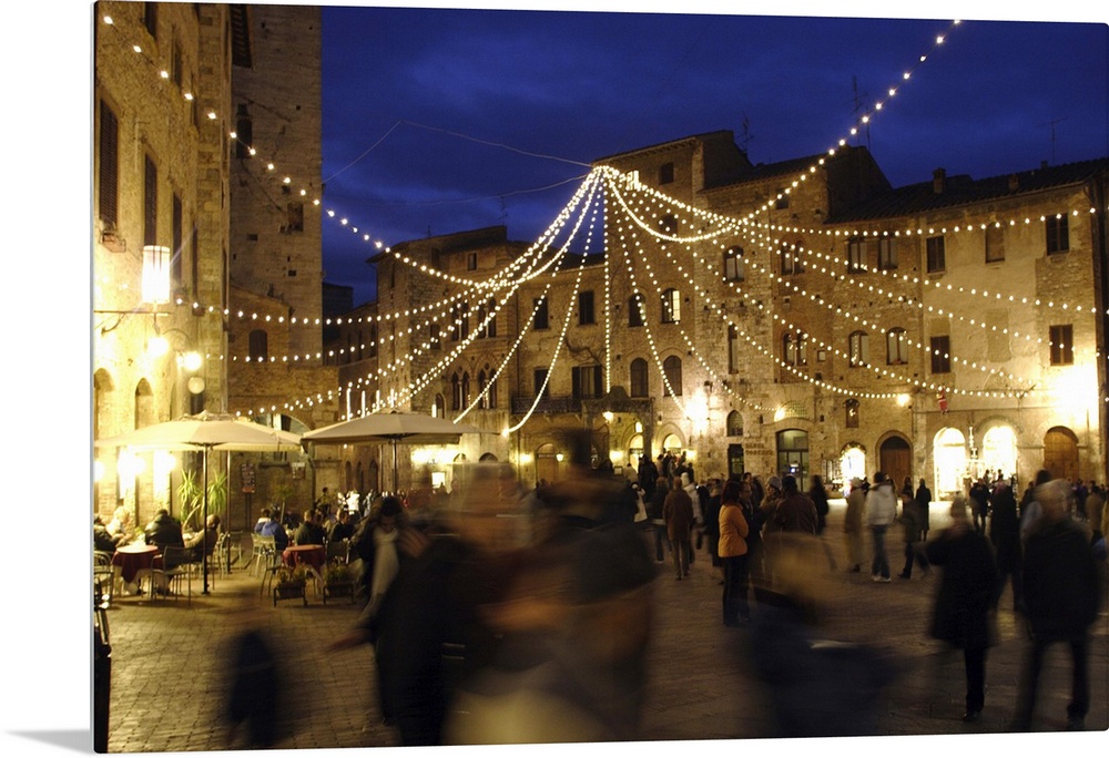 <p>Evening stroll in the central square, under Christmas decorations. San Gimignano is a small walled medieval hilltop town in Tuscany, Italy, about a 35-minute drive northwest of Siena or southwest of Florence. It is mainly famous for its medieval architecture, especially its towers, which can be seen several miles outside the town. The town is also known for the white wine grown in the area, Vernaccia di San Gimignano. San Gimignano was founded as a small village in the 3rd century BC by the Etruscans. The city's documented history begins in the 10th century AD, when it took the name of the bishop, Saint Geminianus, who had defended it from Attila's Huns. In medieval and Renaissance times, it was a stopping point for pilgrims on their way to Rome and the Vatican as it sits on the medieval via Francigena. The city's development was also boosted by the trade of agriculture products from the fertile neighbouring hills. In 1199, during the period of its highest splendour, the city made itself independent from the bishops of Volterra. Divisions between Guelph and Ghibellines parties troubled the inner life of the commune, which still managed to embellish itself with artworks and architectures. On May 8, 1300, San Gimignano hosted Dante Alighieri in his role of ambassador of the Guelph League in Tuscany. The city flourished until 1348, when the plague, Black Death, that hit all Europe compelled it to submit to Florence. San Gimignano became a secondary centre until the 19th century, when its status of touristic and artistic resort began to be recognized. [source: Wikipedia.org]</p>