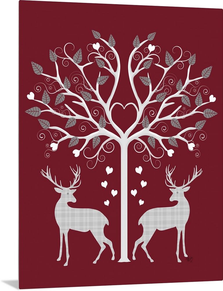 <p>Whimsical Christmas decor with two plaid reindeer standing under a tree filled with leaves and heats, on a deep red background.</p>