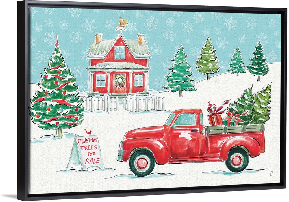 <p>A decorative holiday scene of a vintage truck carrying Christmas trees at a tree farm covered in snow and a blue sky full of snowflakes.</p>