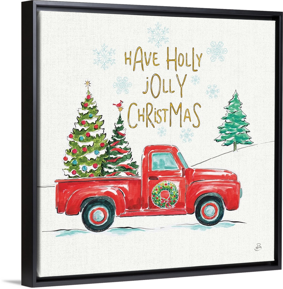 <p>Decorative Christmas themed artwork with the phrase "Have a holly jolly Christmas" written at the top and an illustration of a red truck with Christmas trees in the truck bed underneath.</p>