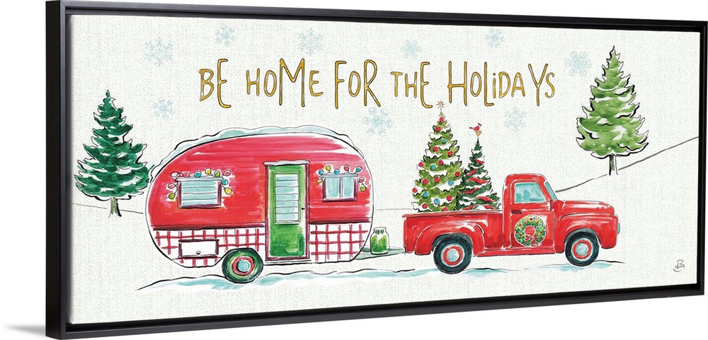 <p>"Be Home For The Holidays" written above an illustration of a red truck pulling a camper and Christmas trees.</p>