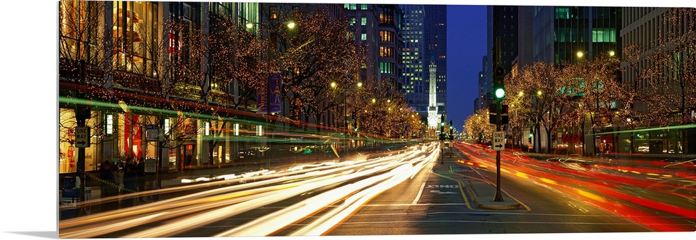 <p>Wide angle photograph looking down a city street of Chicago at night, the trees and storefronts lit with Christmas lights, while light trails stream down the road from passing vehicles.</p>