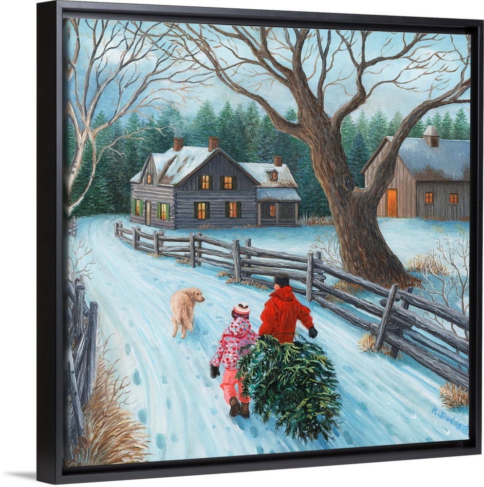 <p>Contemporary artwork of children dragging home a christmas tree.</p>