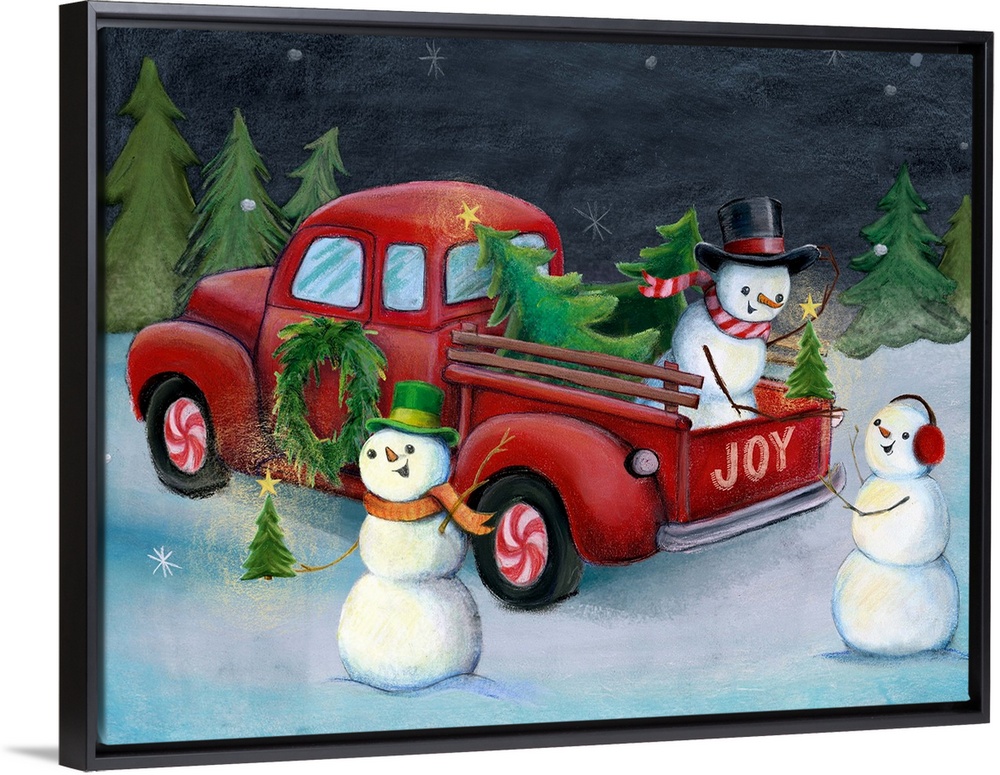 <p>A delightful design of snowmen getting Christmas trees from a truck.</p>