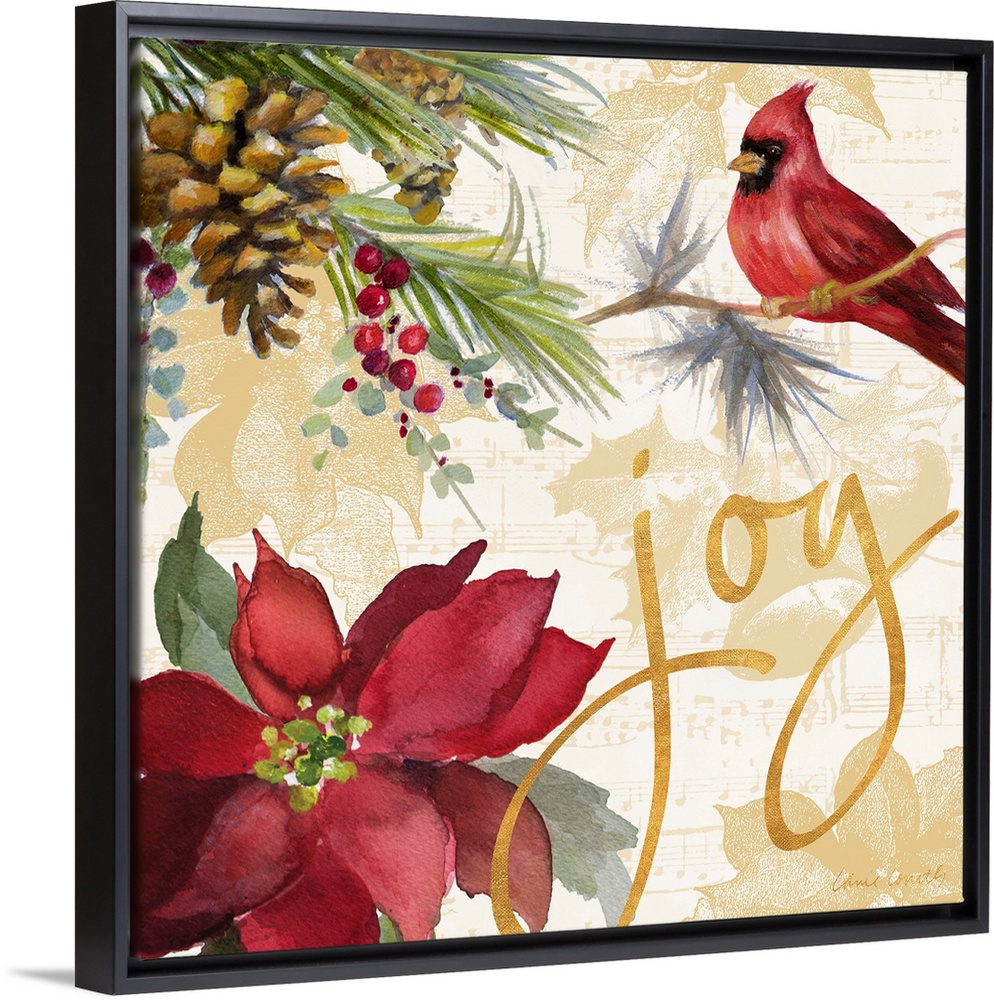 <p>Seasonal holiday artwork featuring a poinsettia and a cardinal, with the word "Joy."</p>