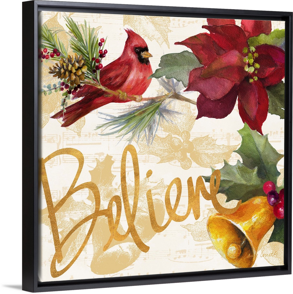 <p>Seasonal artwork with gold text and a cardinal and poinsettia.</p>