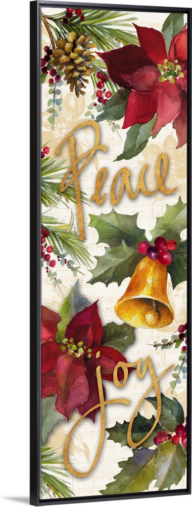 <p>Seasonal artwork with pinecones, poinsettias, and bells with gold text.</p>