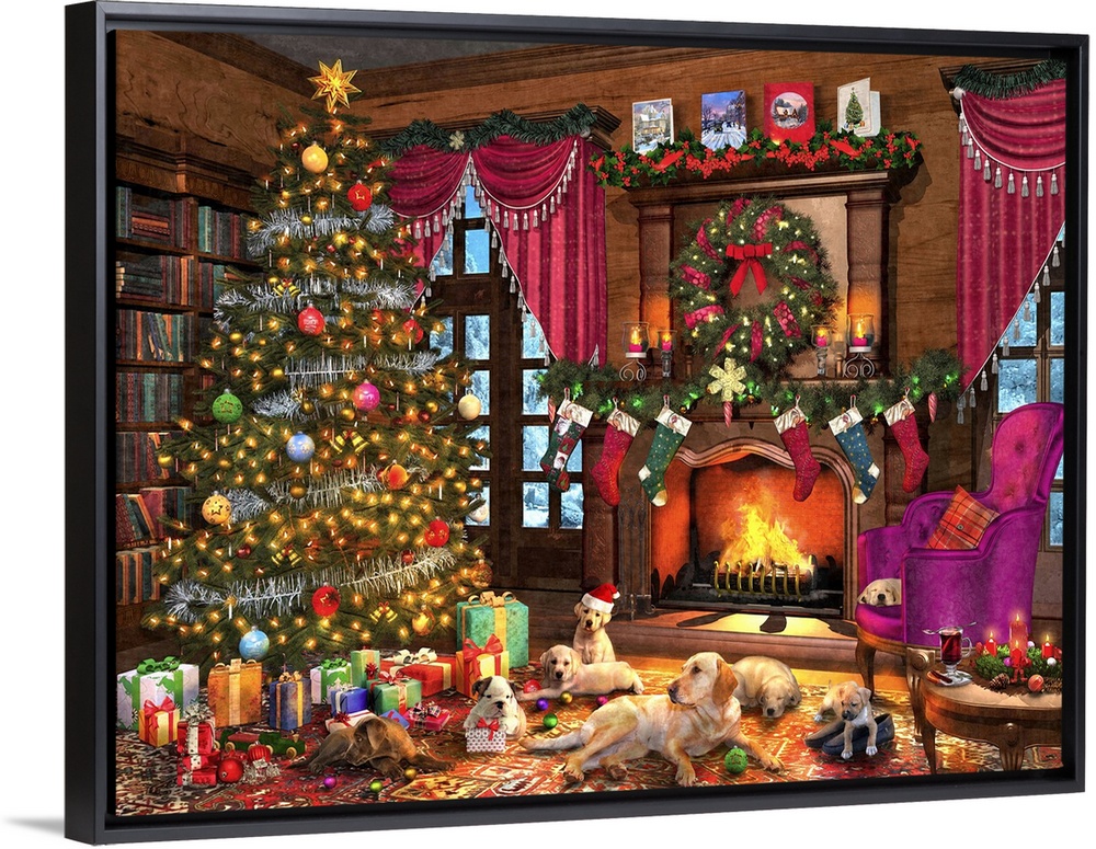 <p>Illustration of a Christmas fireplace surrounded by puppies.</p>