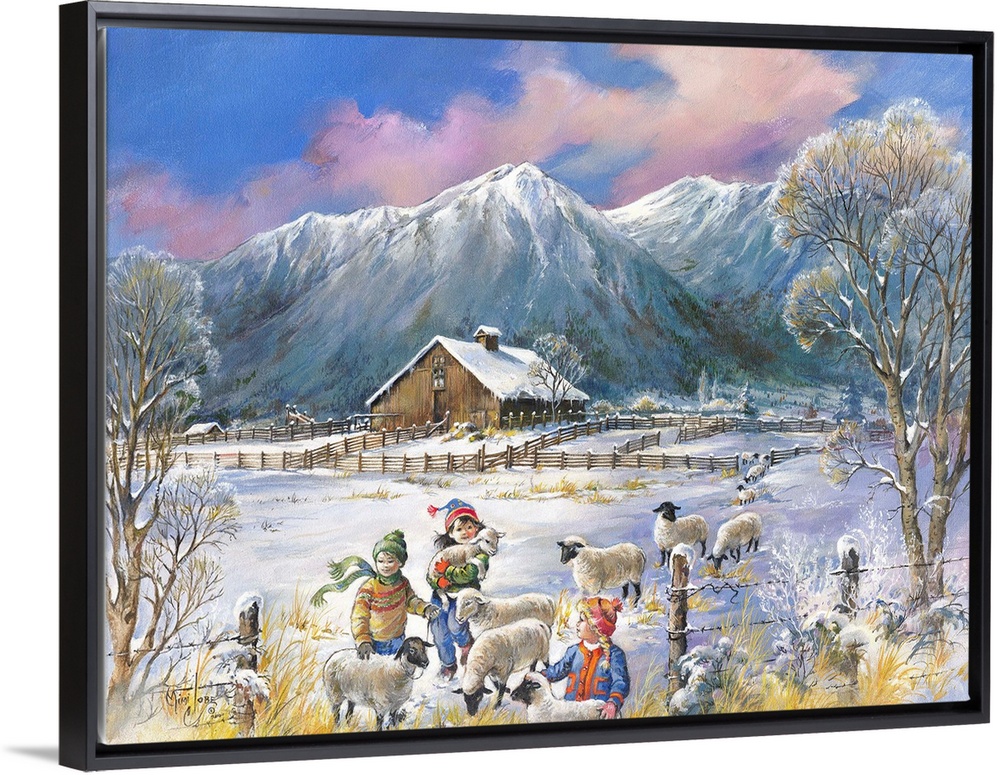 <p>Contemporary painting of children playing with young lambs in the snow.</p>