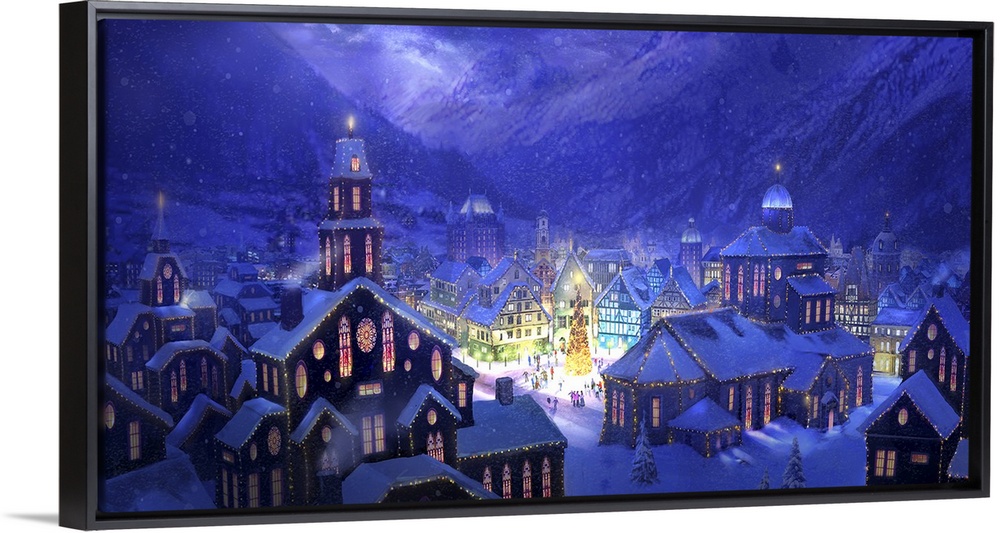 <p>Contemporary artwork of a snowy mountain village illuminated by the Christmas put up by the town.</p>