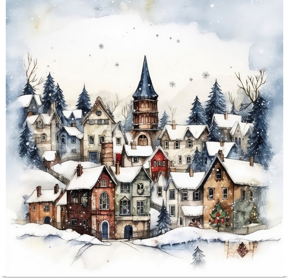 Architecture Houses Art Contemporary Art Winter Holidays Christmas Landscapes Snowscapes Villages Painting The Golden Valley Watercolor