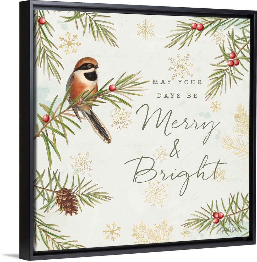 <p>A square holiday design of a bird perched on a pine branch with the text "May your Days Be Merry & Bright" on a beige background with snowflakes.</p>
