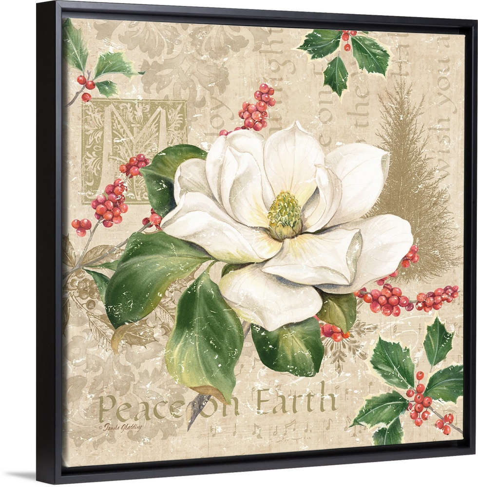 <p>A decorative design of a large magnolia flower and holly on a beige background with text and floral designs and a distressed overlay.</p>